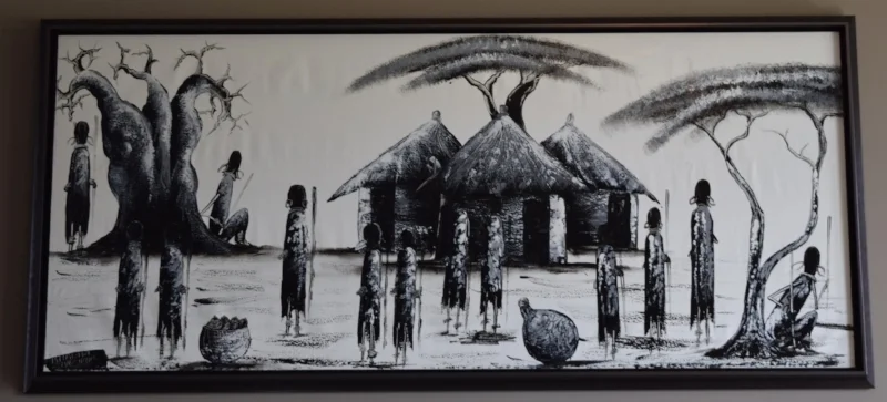 During my volunteer program in Tanzania, I paired up with a local painter who taught me new painting tricks using limited tools, from which I created this black and white painting showing the village of the Masai Tribe.