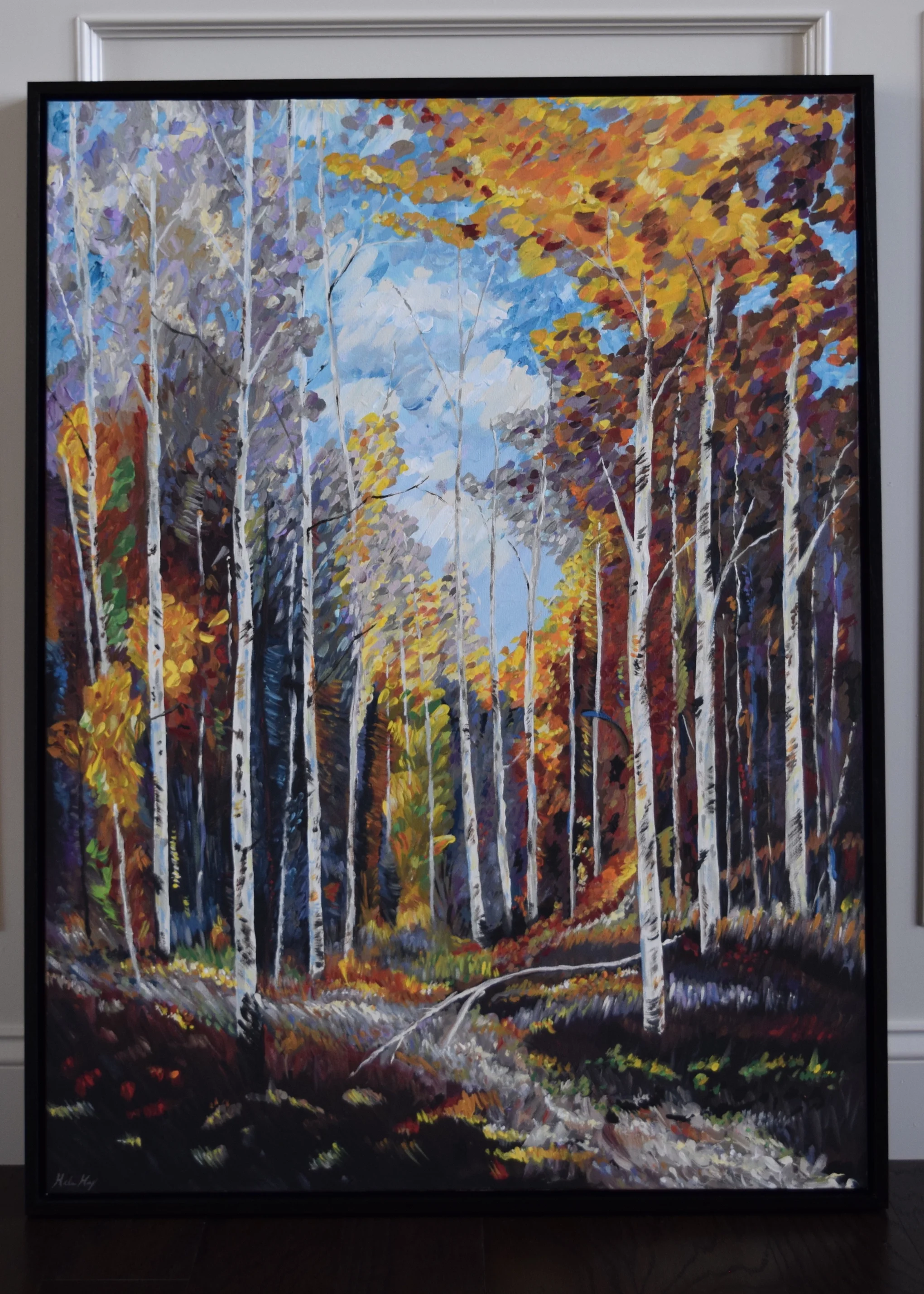 This painting represents my venture into landscapes, blending my favorite abstract strokes with a distinctive landscape scene. The result is a depth of landscape which cannot be done justice without viewing the painting in person, but for this, a photo will have to do.